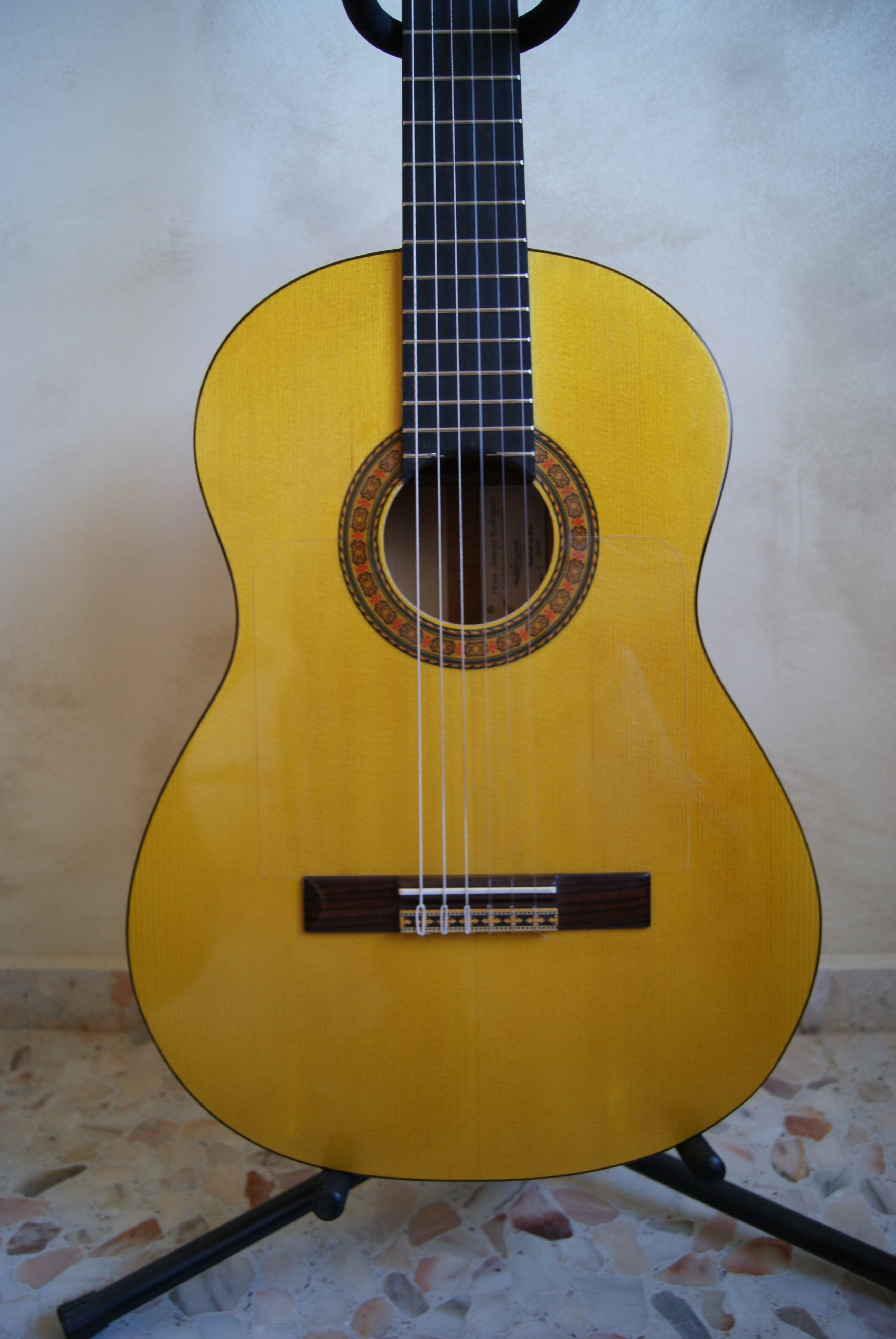 Aquí os dejo la foto de una de las últimas guitarras que se han realizado en el taller de los Hnos. Jiménez Rodríguez. Es una guitarra de estudio hecha a mano con madera de ciprés y pino abeto.